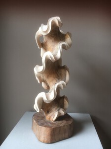 Niet groot omdat het stuk hout (Plataan) dat ik niet wilde opbranden niet groter was. Hoogte 30 cm. en in zijn natuurlijke kleur gelakt met schellak.